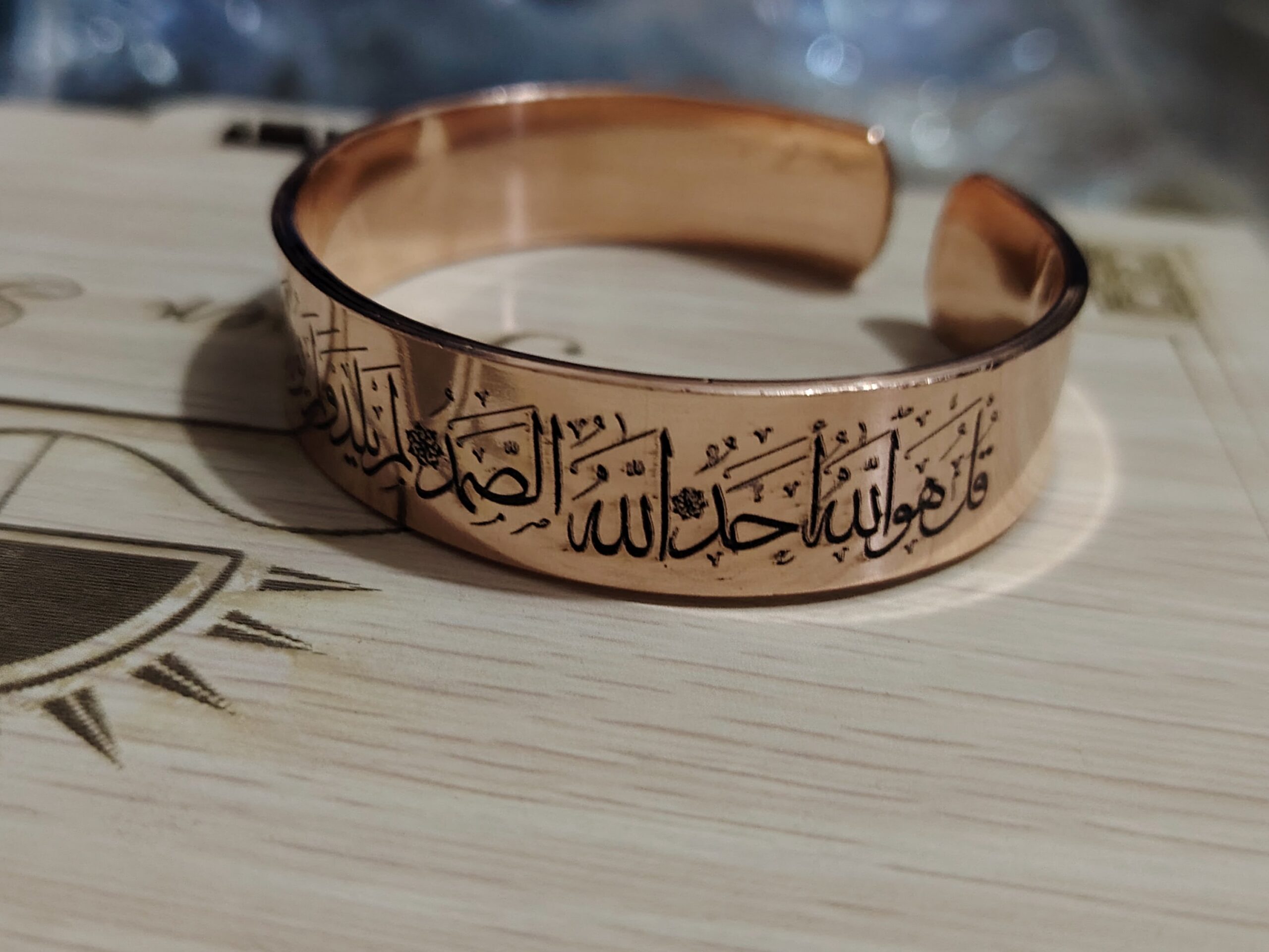 أسورة نحاس صافي منقوشة بسورة الإخلاص بتصميم راقٍ يمنحك أناقة روحية وطاقة إيجابية. خامة أصلية وجودة عالية مناسبة للاستخدام اليومي. اطلبها الآن.